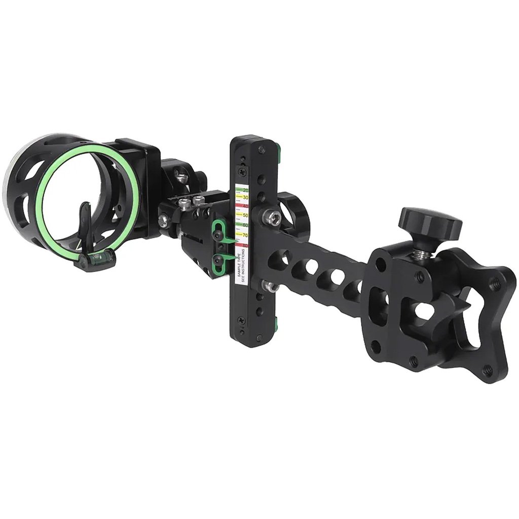 1.8” ID aperture with a bright single (1) 0.19” vertical pin. Micro adjustable windage adjustment. Adjustable for left and right-handed users. Glow ring illuminates fixed level. Fixed bracket with 3 mounting positions