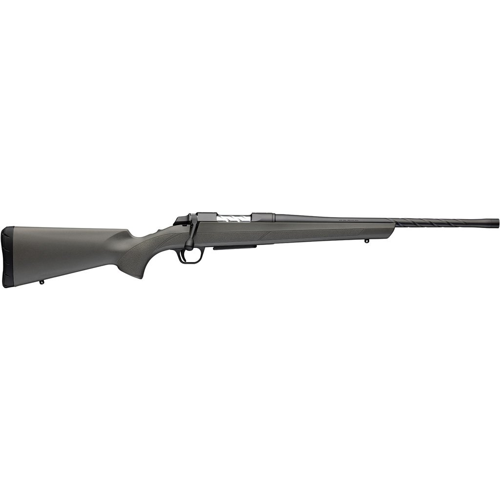 Versatile hunting rifle with spiral fluted barrel and bolt body. Gray/green composite stock. Shorter barrel lengths optimized for suppressor use. Detachable box magazine. Two-piece bolt handle.