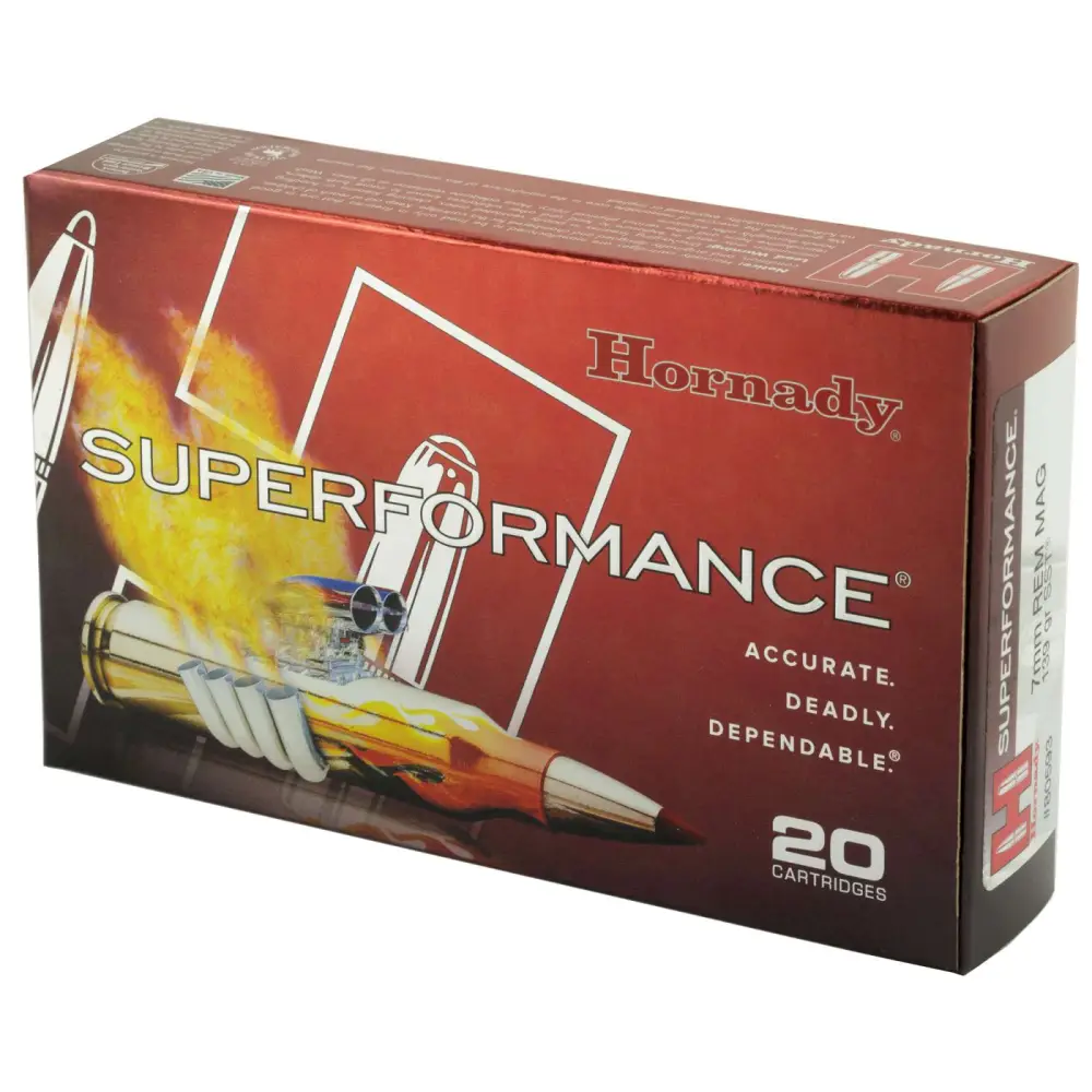 Hornady’s Superformance uses progressive propellants that take your favorite V-MAX, NTX, SST, GMX, InterLock, and InterBond bullets to levels of performance that are simply unattainable with conventional ammunition. It use the highest quality cases and primers available which equals consistent components that translates to consistent shooting in the field. The Superformance ammunition is 100 to 200 fps faster than conventional ammunition and is safe for use in all firearm types, including semi-autos, lever guns and pump actions. This 7mm Remington Magnum load features a SST bullet with a 139 grain weight and comes packaged 20 rounds per box, 10 boxes per case.
