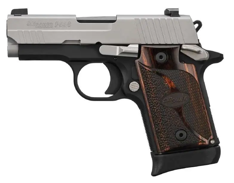 SIG SAUER P938 TWO TONE 9MM STS/BLK WALNUT GRIP 3″ N.S. 1-6RD 1-7RD MAG