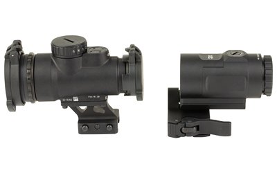 The Trijicon Miniature Rifle Optic (MRO) is a reflex-style, sealed sight intended for use on rifles, carbines, and shotguns to provide fast target acquisition. It is designed to be used with both eyes open, providing the operator with maximum situational awareness. The large aperture and tapered light path maximizes the viewing area in such a small optic, allowing for fast target engagement – especially from non-standard shooting positions. It also features ambidextrous brightness controls, sub-flush adjusters, advanced lens coatings, and a fully sealed, waterproof, hard anodized forged 7075-T6 housing, making the MRO the ultimate mini reflex sight. The Trijicon Miniature Rifle Optic (MRO) HD Magnifier is a 3 power reflex optic magnifier specifically designed to magnify the target and target seen through the MRO HD red dot optic. By magnifying the target the shooter is able to use the crisp dot in the MRO HD to quickly and accurately engage targets at extended distances. The MRO HD Magnifier is short and compact which saves weight and rail space. The design features easy-to-set flush, toolless adjusters that make centering the reticle in the field of view easy. The adjustable diopter allows the user to tune the optical performance to their eyes.