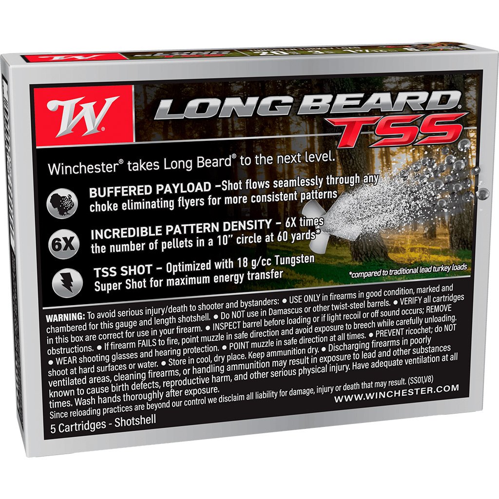 Winchester Long Beard TSS Load in 20-gauge delivers superior turkey hunting performance in a lightweight platform. This 3-inch shell carries a 1 9/16-ounce payload of #8 Tungsten Super Shot with 18 g/cc density, engineered for maximum energy transfer and terminal effectiveness. Producing 6 times the pellet count in a 10-inch circle at 60 yards compared to traditional lead, it offers outstanding pattern density at extended ranges. The buffered payload flows cleanly through any choke, reducing flyers and improving consistency. With a muzzle velocity of 1100 fps, it’s an ideal choice for hunters seeking tight patterns and long-range capability.