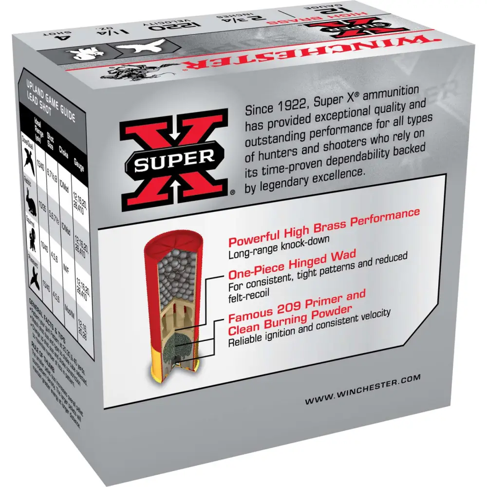 Super-X high Brass provide time proven dependability for consistent performance at an exceptional value. These shells provide powerful high brass performance for long-range knock-down power and a one-piece hinged wad for consistent, tight patterns and reduced felt-recoil. With a 209 Primer for reliable ignition and consistent velocity.