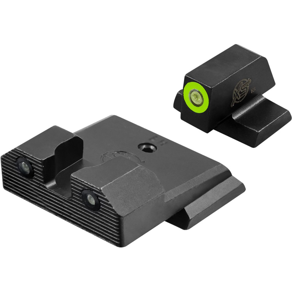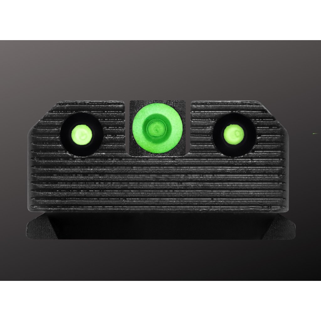The R3D 2.0 Pistol Night Sights feature tritium-powered front and rear sights with a high-contrast glow dot for low-light visibility. A photoluminescent ring absorbs ambient light to enhance sight acquisition in transitional lighting conditions. The rear sight uses a wide notch with serrations and an anti-reflective lens to support a clear sight picture. A corrosion-resistant black nitride surface finish supports durability for long-term use.